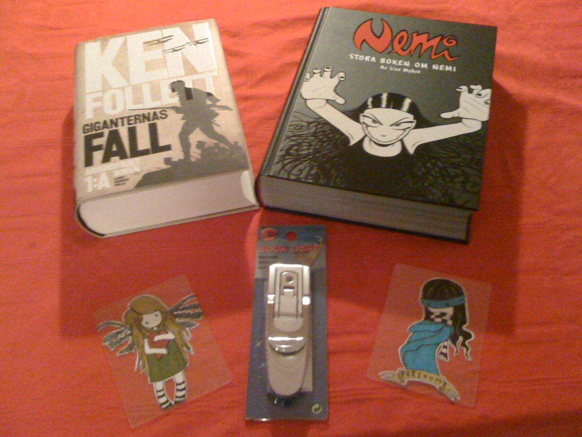 Giganternas fall fick jag av mamma och pappa. Stora boken om Nemi, läslampan och de två bokmärkena fik jag av bror och Mya. Mya har själv gjort dem :). Jag måste visa T-shirten hon gjorde åt sambon, den föreställde figurer ur Trolltyg i Tomteskogen. Men T-shirten är i sovrummet och sambon ligger där och sover. Han ska till skillnad från mig jobba imorgon.