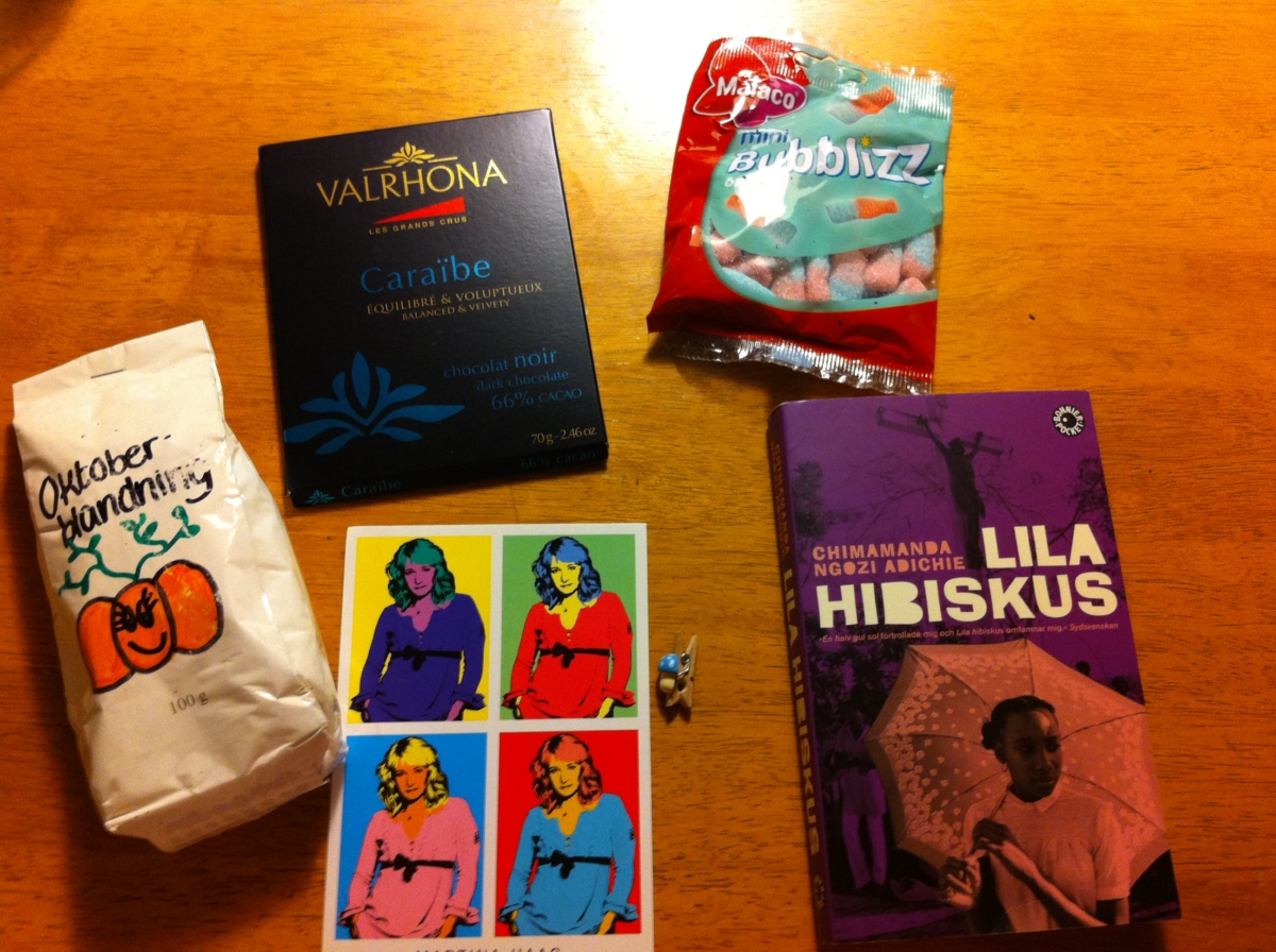 Spännande te, choklad(!) som jag aldrig provat, mumsigt godis, liten söt svampklädnypa och boken Lila Hibiscus med min favoritförfattare Chimamanda Ngozi Adichie. Boken har jag redan läst och äger på engelska. Men det gjorde absolut inget att jag nu fått den på svenska. 🙂 Boken är ju så bra!