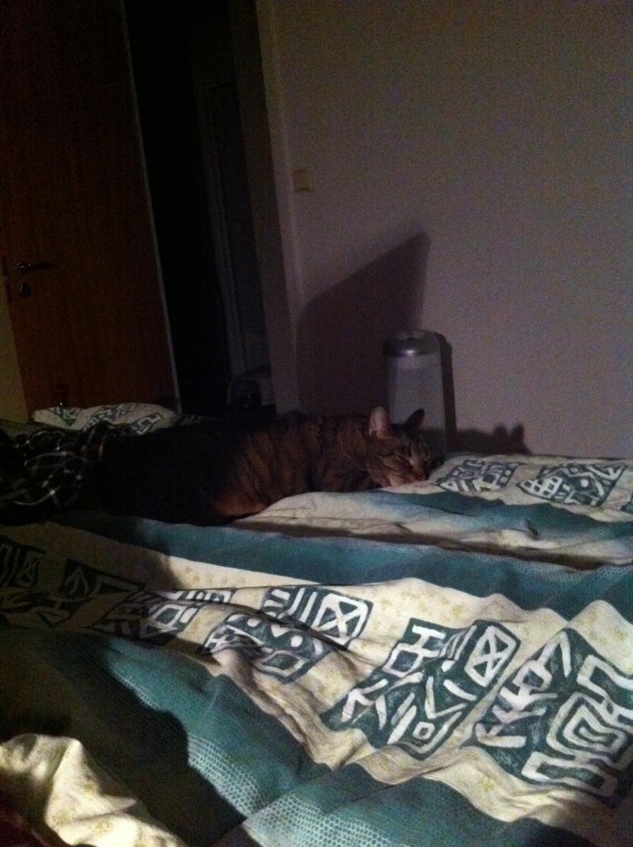 Sambon har övergett mig och åkt på jobbresa till Atlanta. Han åkte iväg klockan sex igår morse och kommer tillbaka nästa söndag. Det innebär att jag kommer åka mycket tåg nästa vecka. Jag måste ju komma hem varje dag för Lussekattens skull. Han har förövrigt vaktat mig hela dagen. När husse packade i det sista i väskan lade sig Lusse på mig för att hindra mig från att ge mig iväg också. Han tyckte inte om att jag stack iväg på en promenad med Y. Men han tyckte det var bra när jag stannade hemma hela kvällen och kollade på film med A. Nu ligger han i sambon säng bredvid mig och sover.