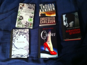 Jag har än en gång fått bevisat att det är förenat med absolut livsfara att gå in på bibliotek! Idag när jag var på biblioteket i jobbstaden hittade jag flera intressanta böcker. Faktiskt fler än de jag faktiskt lånade hem. På nedervåningen där skönlítteraturen huserar hittade jag Den enögda kaninen och Colombes granne. Jag undvek att gå till den del där de engelskspråkiga böckerna står. Istället gick jag uppför spiraltrappan(som jag hatar) och tittade bland böckerna på ungdomsavdelningen. Där hittade jag Pojkarna, Frost och Cinder (som jag såg på bokhandeln förut). Sen fick det vara nog. Det är svårt nog att gå ner fär en smal, brant spiraltrappa med en tung ryggsäck, fullproppad tygpåse och 5 böcker. Det blev också krångligt att släpa böckerna därifrån utan kasse. Bibliotekets egna plastkassar är helt värdelösa så det är lika bra att bära böckerna utan kasse. De går ändå bara sönder.