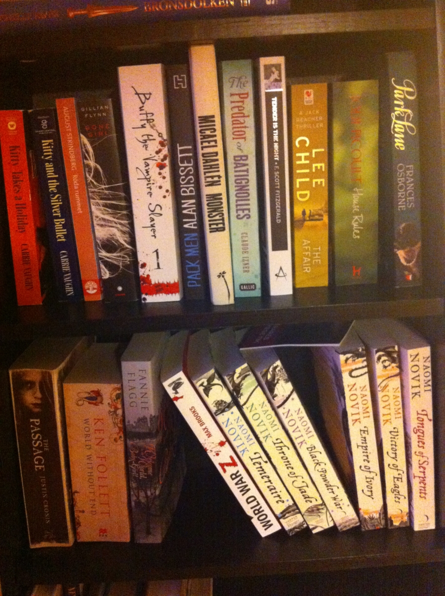Andra raden: The Passage, World Without End, Welcome To The World Baby Girl, World War Z, Throne of Jade, Black Powder War, Empire of Ivory, Victory of Eagles, Tongues of Serpents.