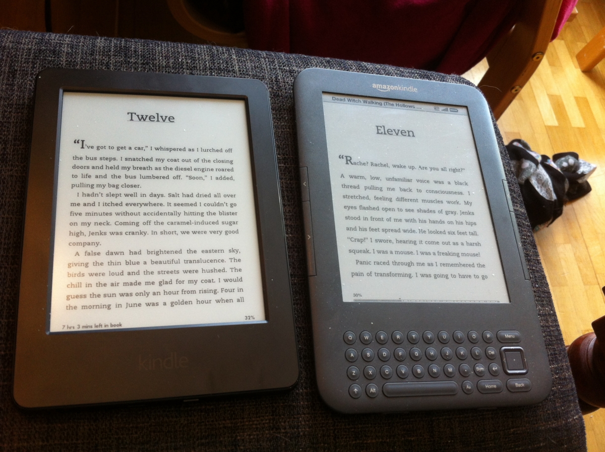 Kindle 7 har till skillnad från AmazonKindlen (version gammal) touch screen. Den är också lättare att använda och att  hitta allt på.  Kindle 7 är ca 2 cm kortare men är lite tjockare. Me loves my new kindle. Jag vet att det finns en massa andra versioner som är flashigare, men jag kände inget behov av att äga en sådan. Jag ska läsa på den och är nöjd om det fungerar.