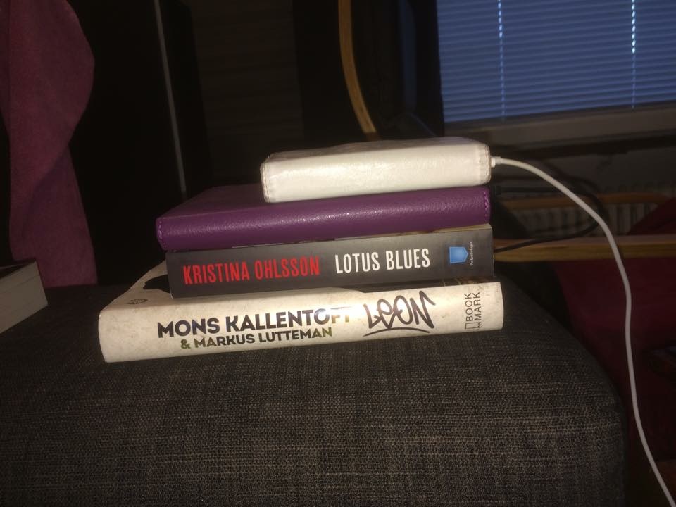 Den lila boken är min Kindle som The Summoning finns på. Och på den vita iPhonen lyssnar jag på Vårjakt i Rosengädda genom Storytel.