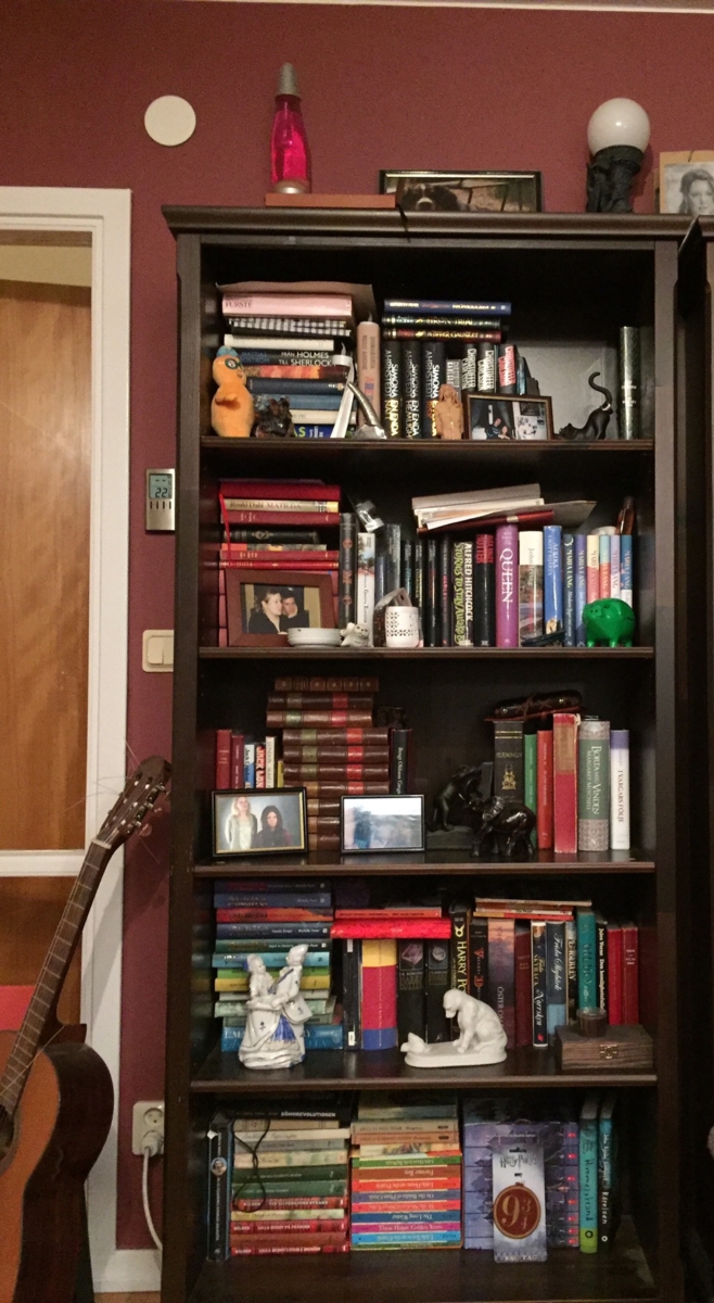 Sedan hade jg tänkt läsa större delen av söndagen men så blev det inte. Istället plockade vi ner våra cd-skivor, åkte iväg med grejer till det andra förrådet och svärföräldrarna kom på besök. Sen organiserade jag om i bokhyllorna och har fyllt 3 st papperskassar  med böcker som ska skeppas iväg till Myrornas. En hög böcker ska iväg till olika vänner också.