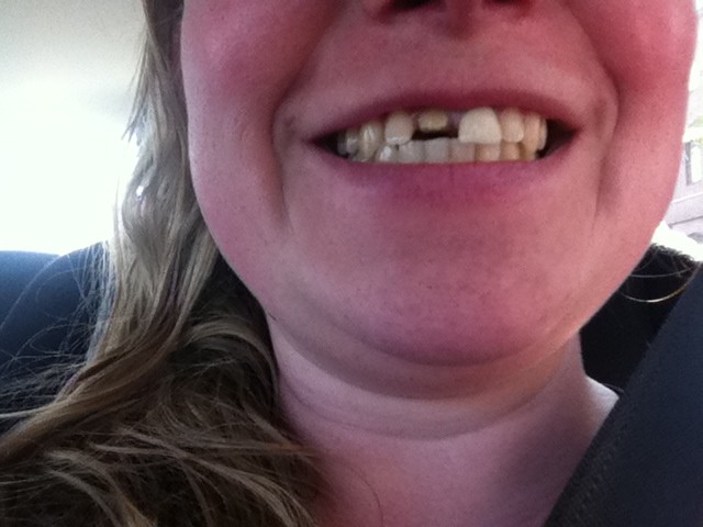Igår var det meningen att vi skulle se det första bandet för dagen men det hände en liten olycka. Eller liten och liten. Där står jag och duschar i godan ro så ramlar min vänstra framtand ut. Nu kanske jag ska berätta att mina framtänder är porslinskronor eftersom jag slog av dem när jag var 7 år. Så det blev till att ragga tandläkare. Jag går ju hos en privattandläkare i min jobbstad och f.d hemstad 8,5 mil bort. Men jag förökte ringa nån tandläkare här i Gävle, men de ringde inte ens tillbaka. 🙁 Som tur var fick jag komma till min tandläkare iallafall. Så det blev en resa på 15 mil tur och retur för att limma fast en tand. 550kr kostade det också + bensinpengar. Men det var det värt jag såg ju ut som en 7-åring eller som jag varit i slagsmål. Kolla själva: