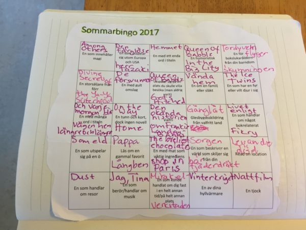 Jag deltog i Sommarbingo 2017 som har en facebookgrupp. Det är Cecilia Brodelius Agemark som är admin och som skapat bingobrickan (men fått förslag från andra också efter vad jag förstått) Sommarbingo 2017 pågick från 1/6 till och med den 31/8, Det var första gången jag deltog i Sommarbingo och det var jättekul. I början läste jag bara det jag ville läsa och kryssade av rutorna som passade. Men mot slutet fick jag lite mer strategiskt för att få full bricka.